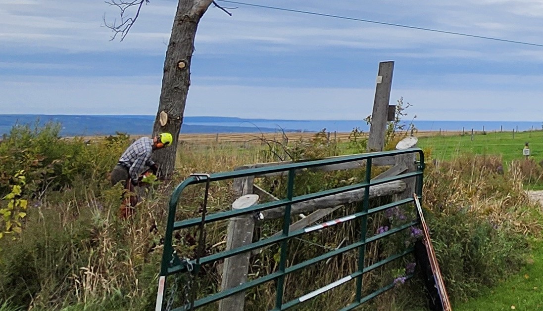 Two large hazardous trees were removed at our property frontage by Dave Brodie and Jill Smith-Brodie. Dave is a certified arborist with the Bruce Trail Conservancy and he and Jill happily obliged us by bringing their skills to bear on the need to safely handle these trees. A special shout out to them both for expertly dealing with a task that we would have otherwise had to contract with professionals!
