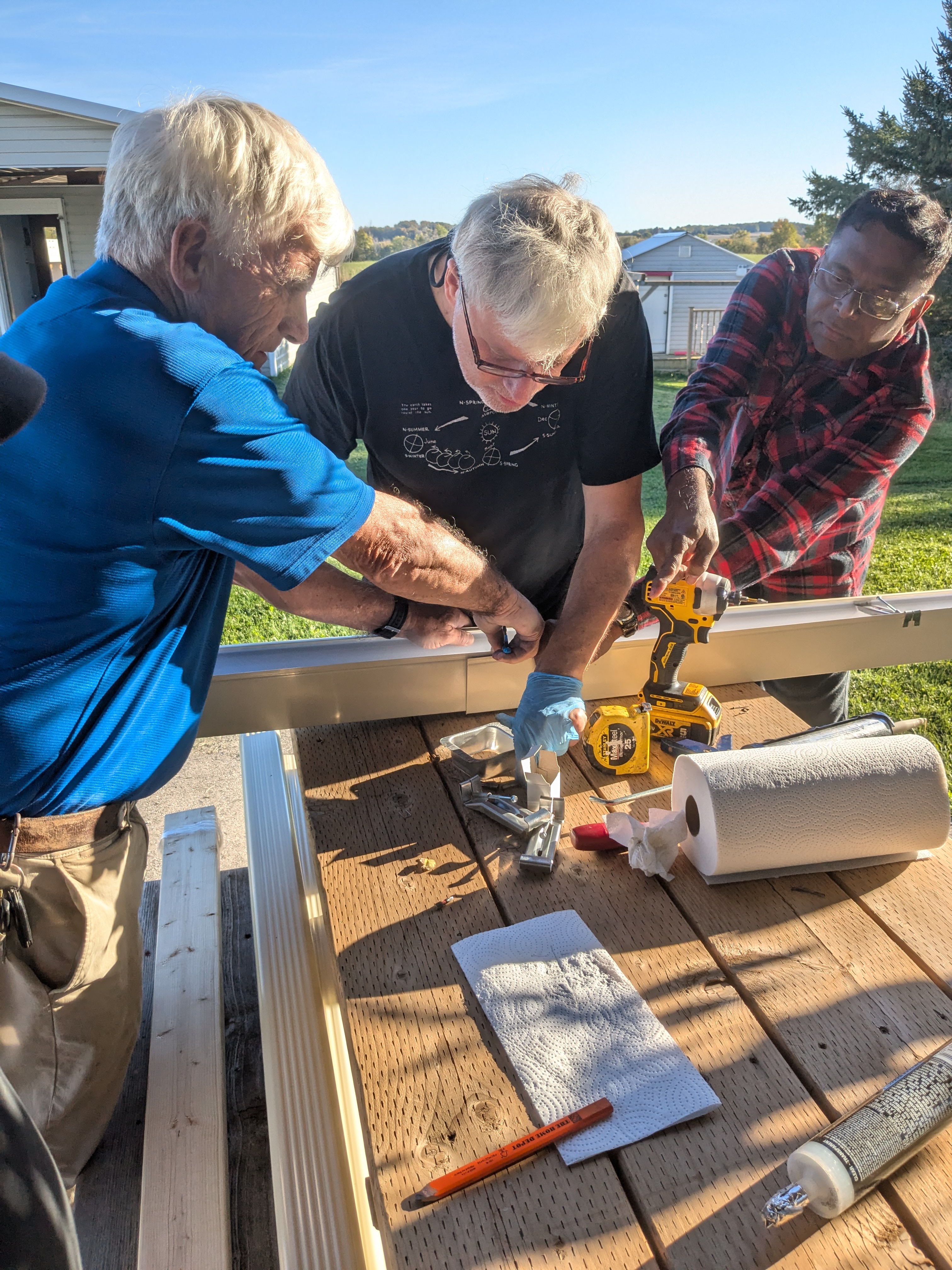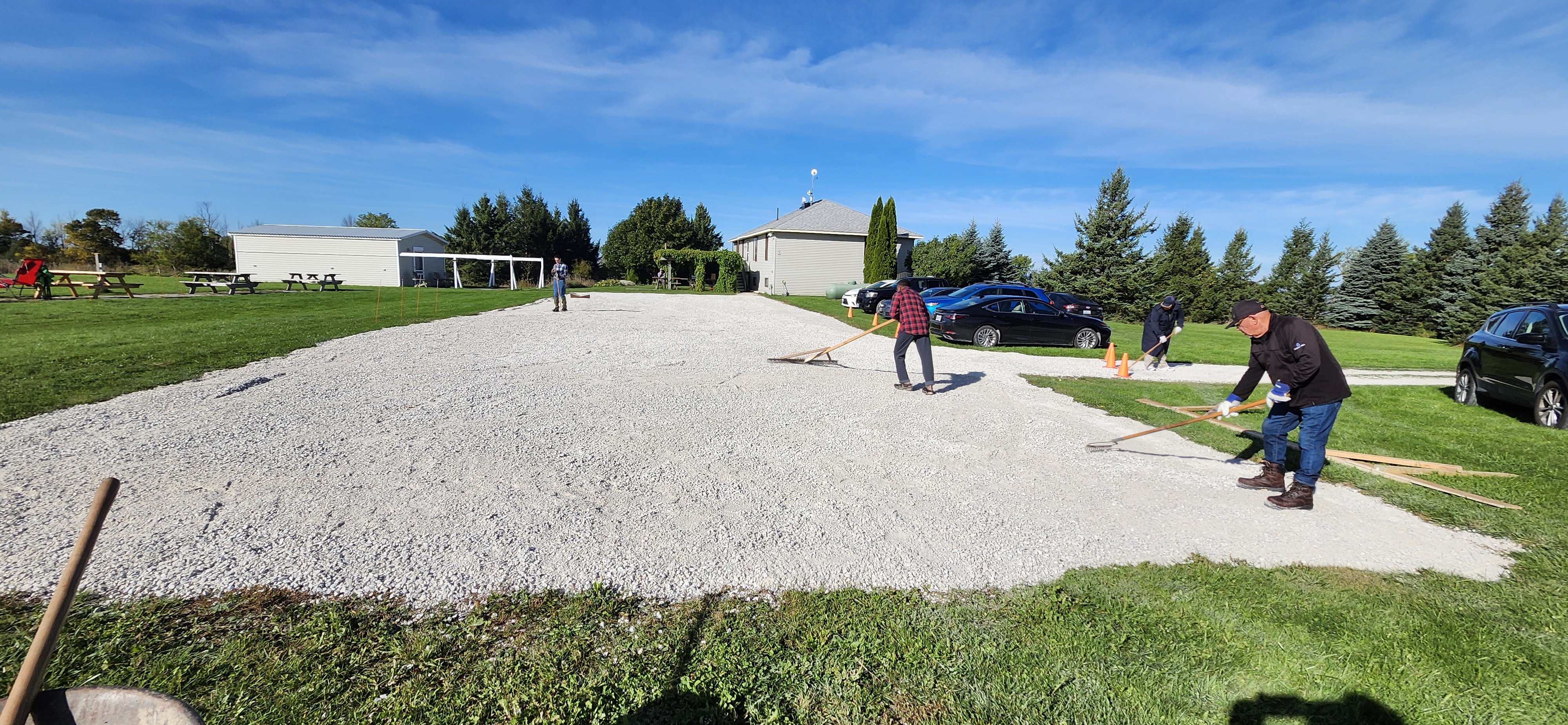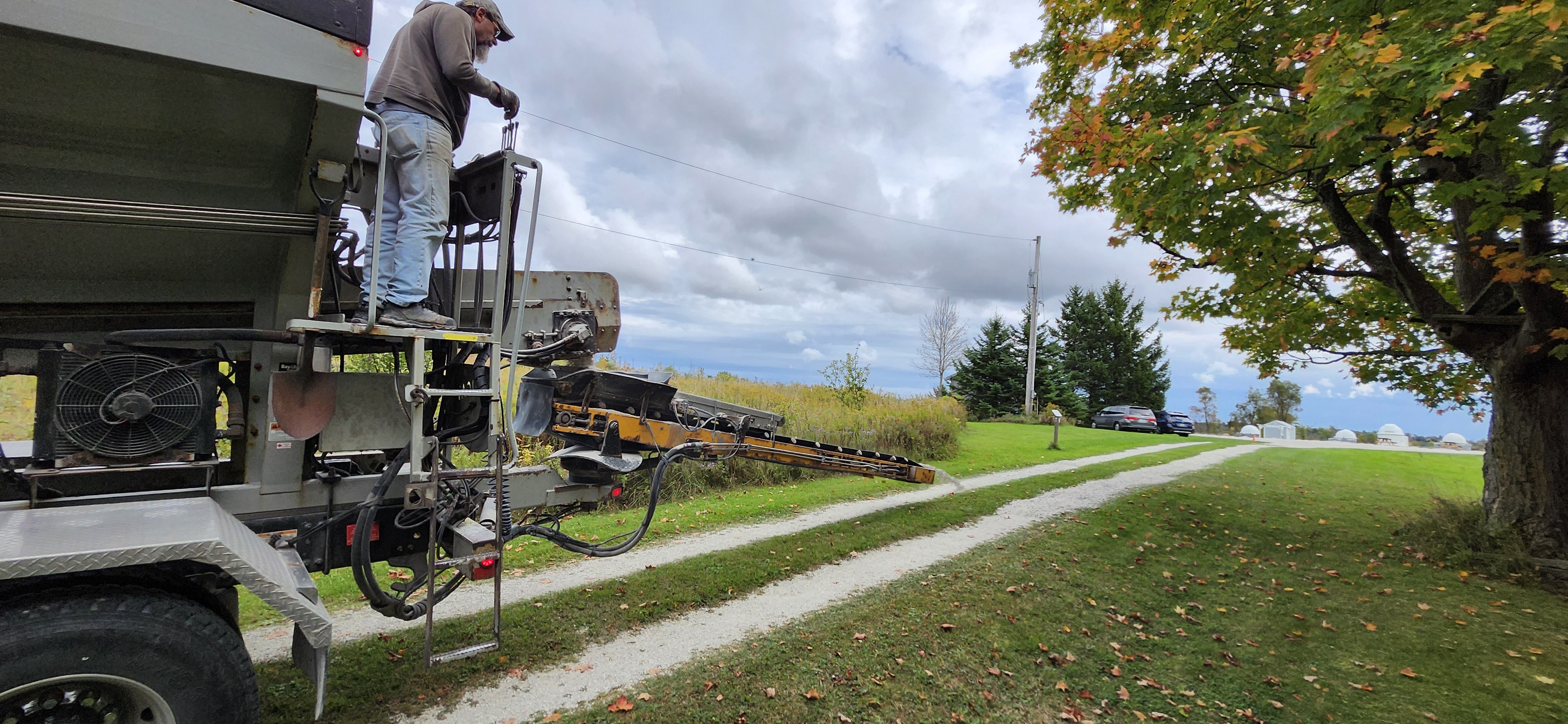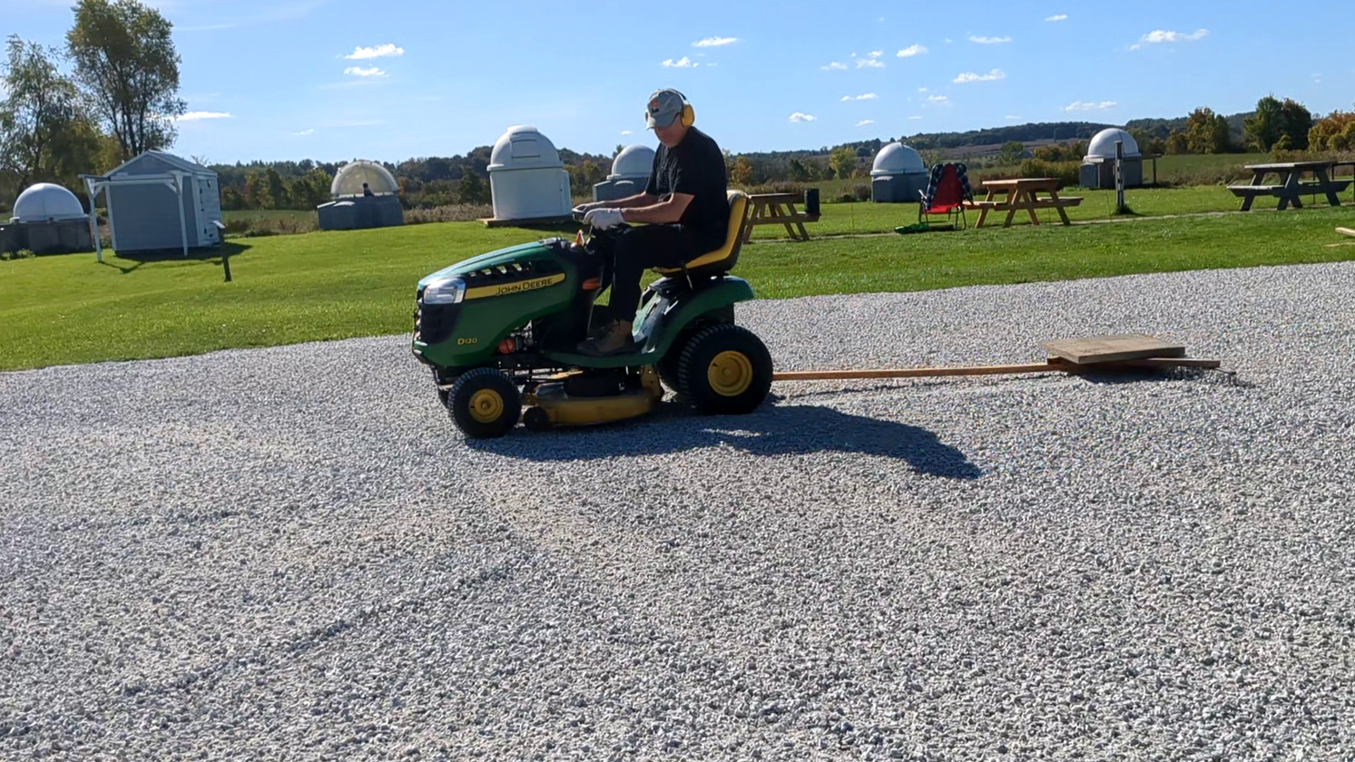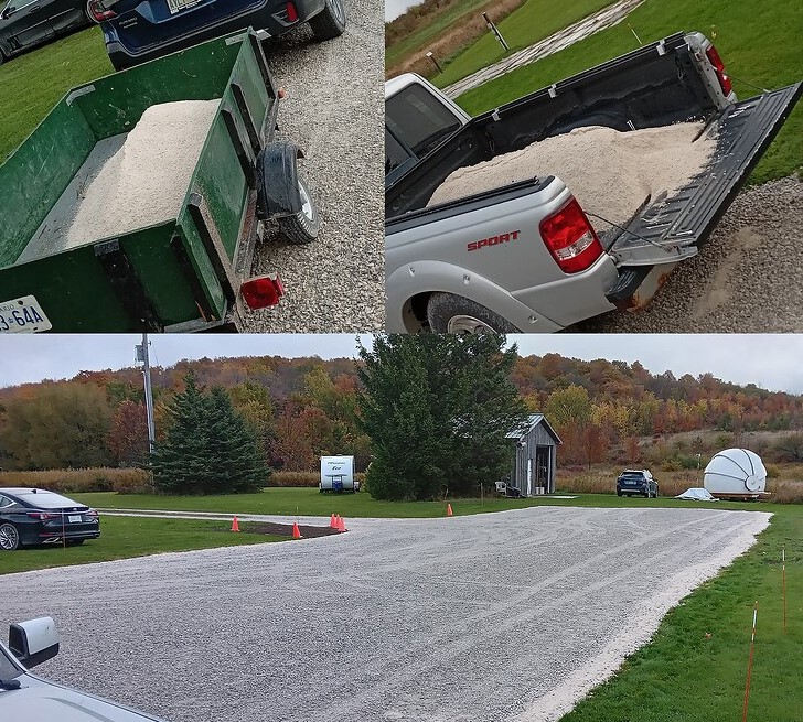 Then on the following two weekends several more volunteers continued work on several projects that were not competed at the work party. This included picking up and distributing a half-yard of limestone screenings around the perimeter of the parking area, the packing of the POD for sale into our trailer, finishing the downspout on the new eavestrough, removing and replacing the wiper seal on the bathroom window, tending to the SLO building’s roof track area to prevent the ingress of squirrels and mice and resetting the polar alignment of the main pier mount, replacement of the house water filter cartridge, mowing all the lawn area, picking up additional limestone screenings and placing a border around the fresh parking area, and even digging out a fouled ditch at the corner to prevent winter melt flooding. Wow!