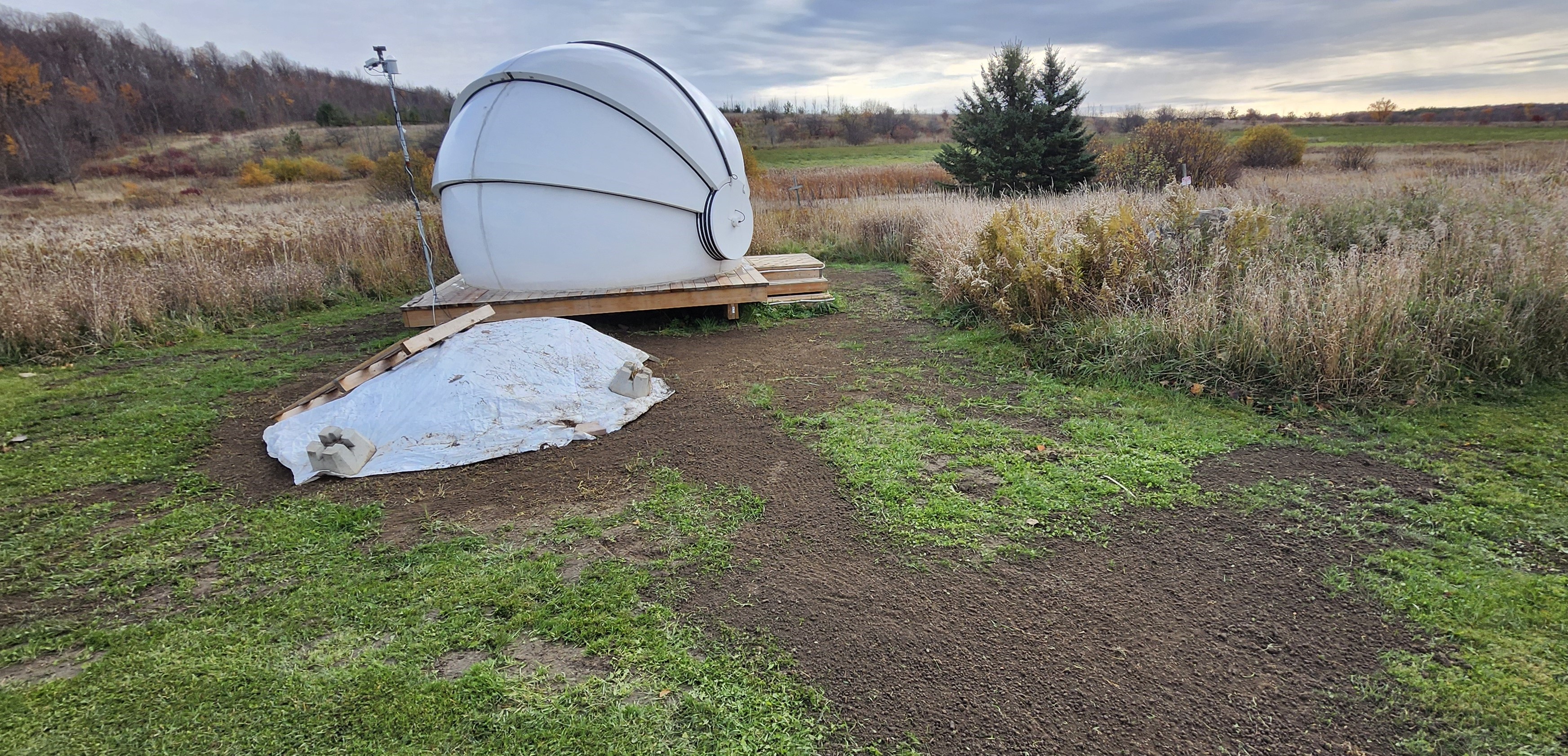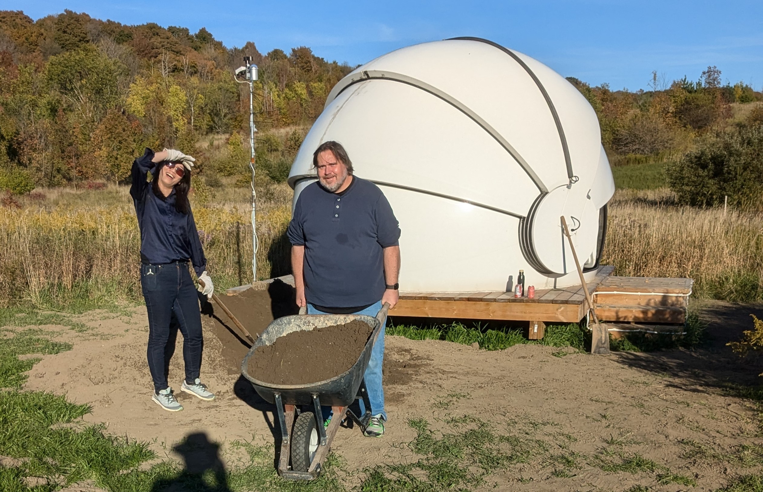 We received and graded 40 cubic yards of crushed stone to help manage weed growth in our parking area and driveway lane and distributed 8 cubic yards of topsoil in the damaged areas around the new U of T dome and low spots around the parking area. The wheelbarrow, shovels and rakes were very busy! A 54-foot eavestrough was installed on the south side of the house to collect and divert water that was being trapped there and caused some flooding during the storms of this past summer.
